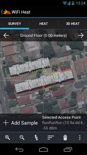 WiFi Heat is simple to use--you can create an informative map in minutes. It will create a detailed heatmap that can be used for adjusting your wireless access point settings or location for maximum speed, signal quality and best coverage. You can either use your own floor plan, or simply use Google Maps satellite view. Once you have a map imported into WiFi Heat, you simply walk around the area the map represents and mark your position.